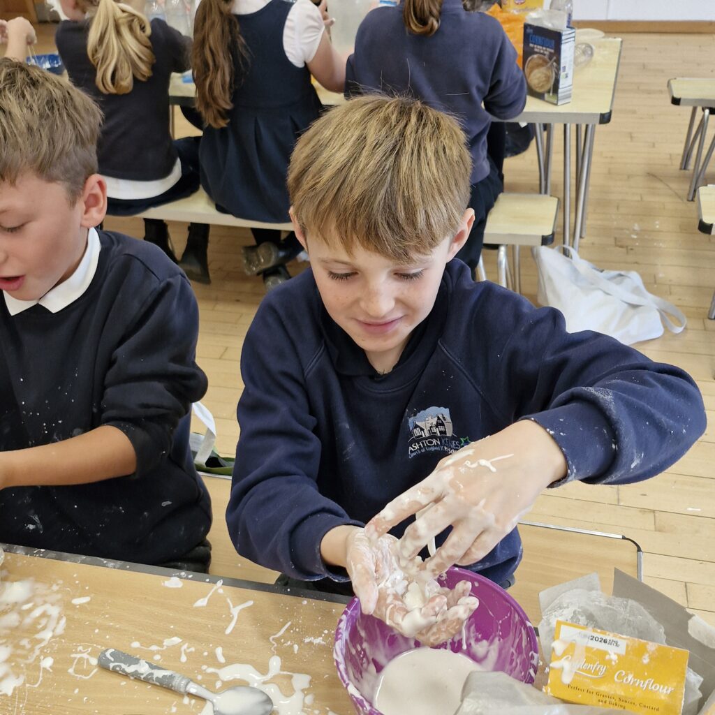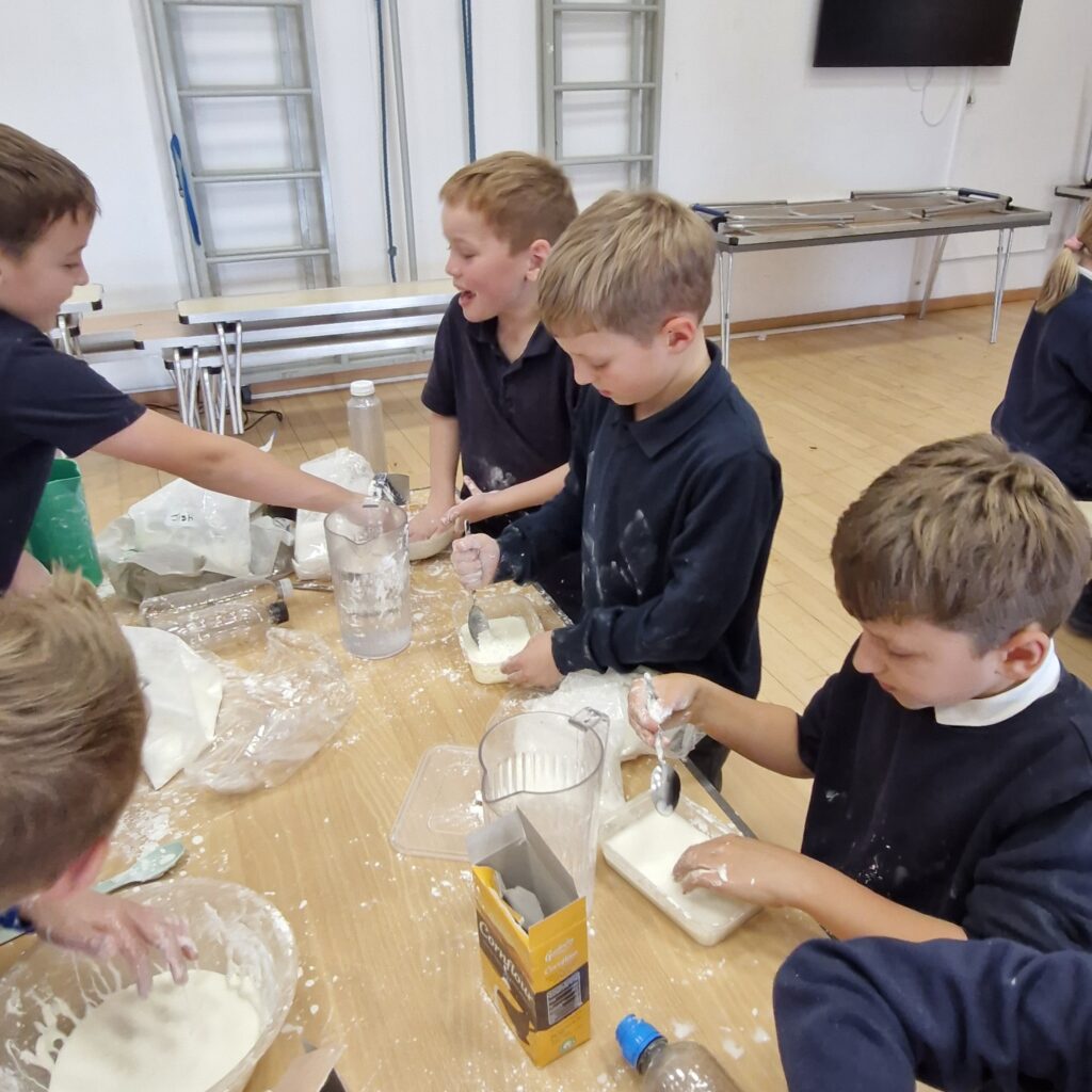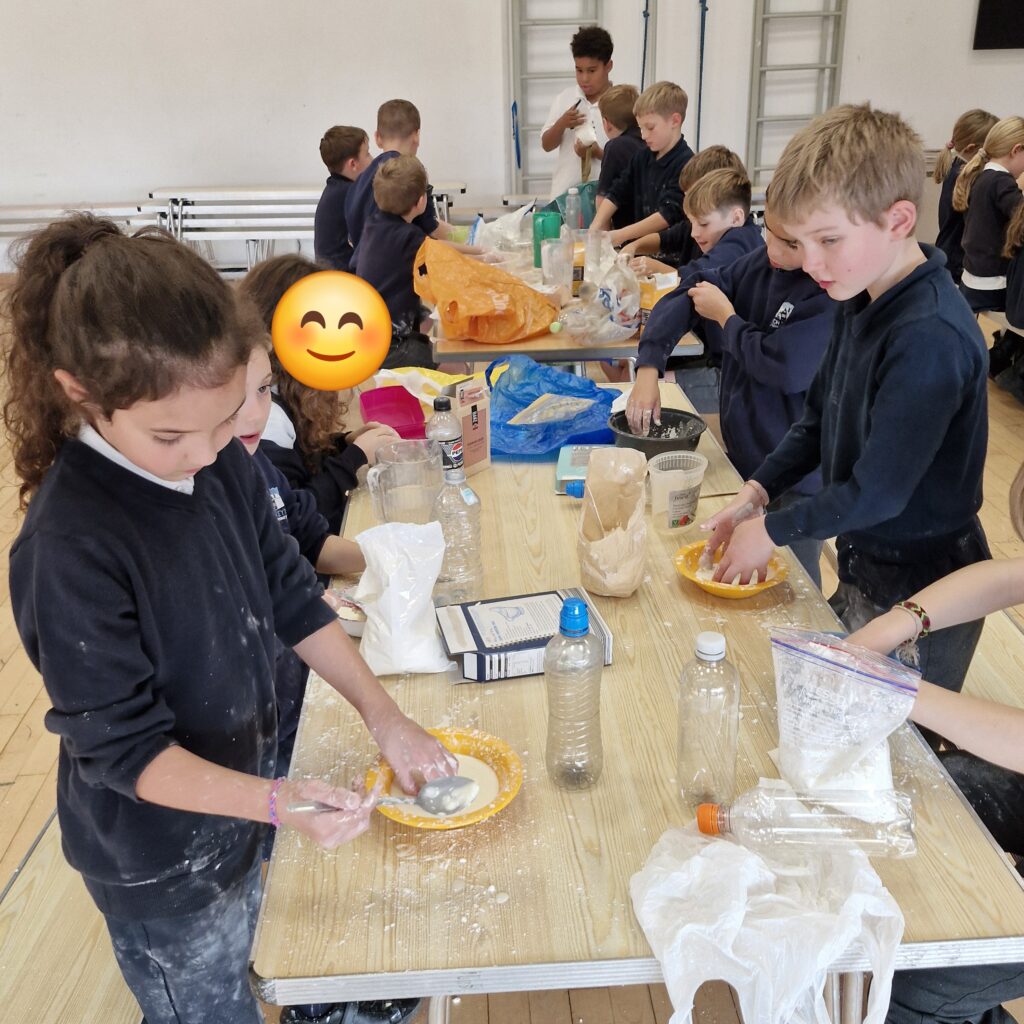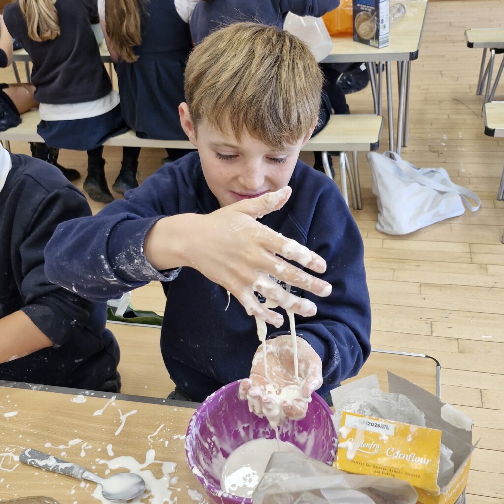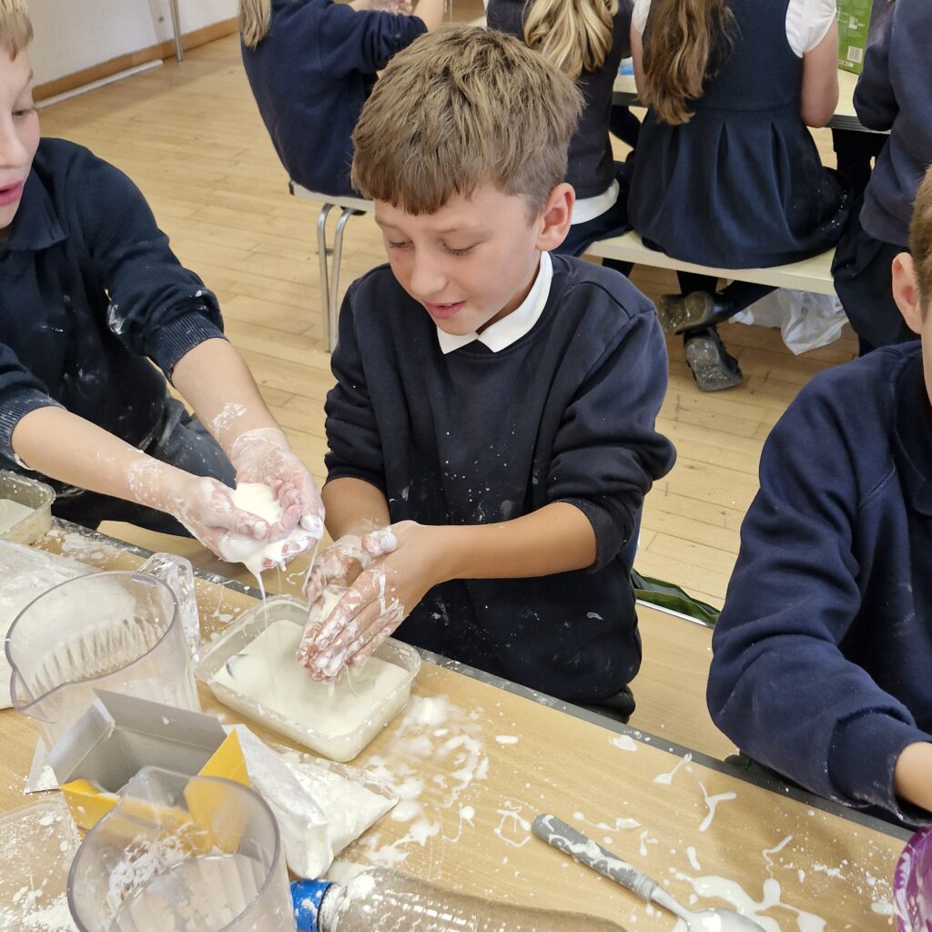 The children have been learning about solids, liquids and gases and their properties. In this practical session they made non-Newtonian fluid (better known as oobleck) and noticed how it behaved like both a solid and a liquid depending on when force was applied. They also made lava lamps and noticed how the bubbles of gas carried some of the coloured water with them.