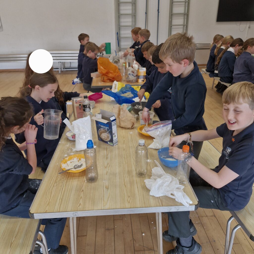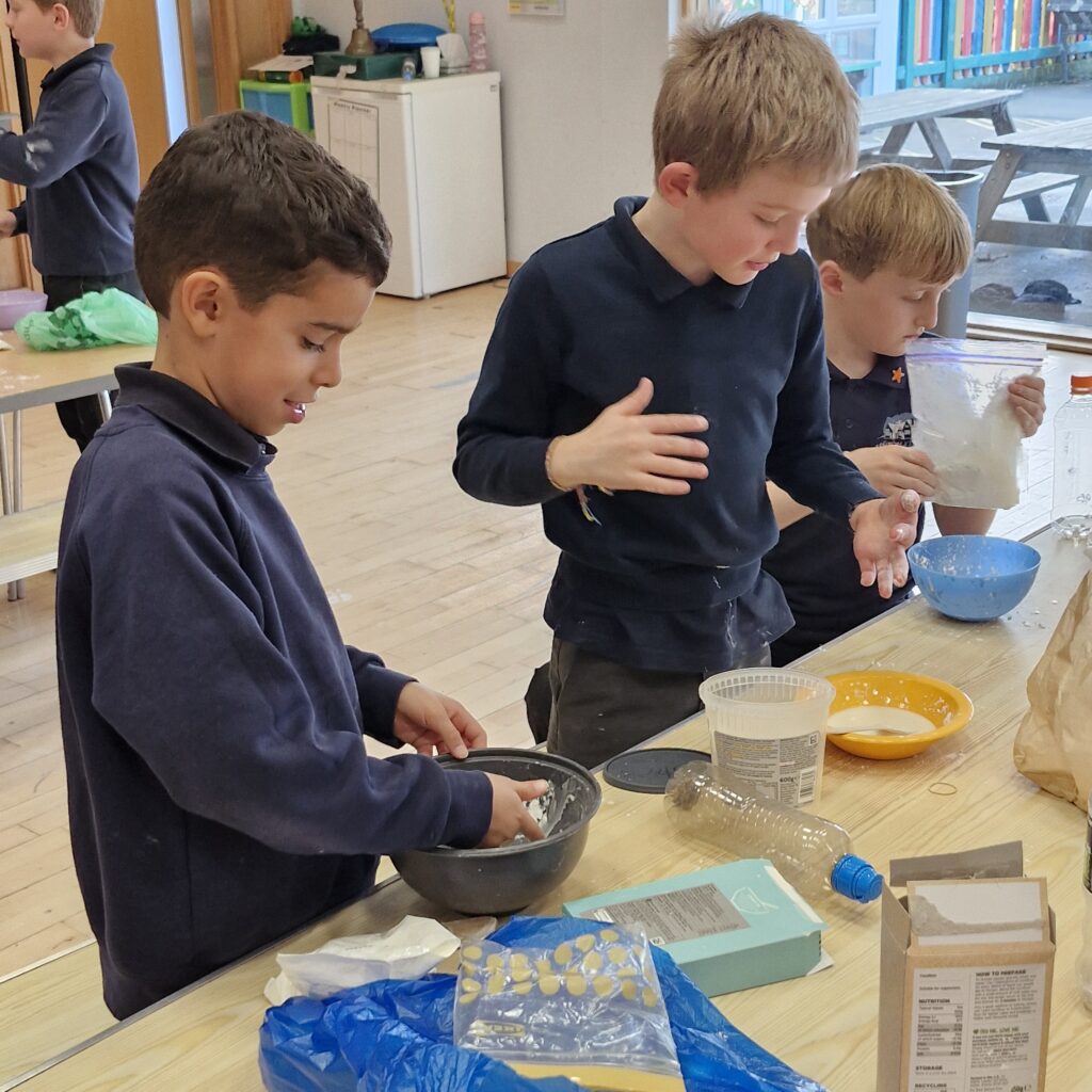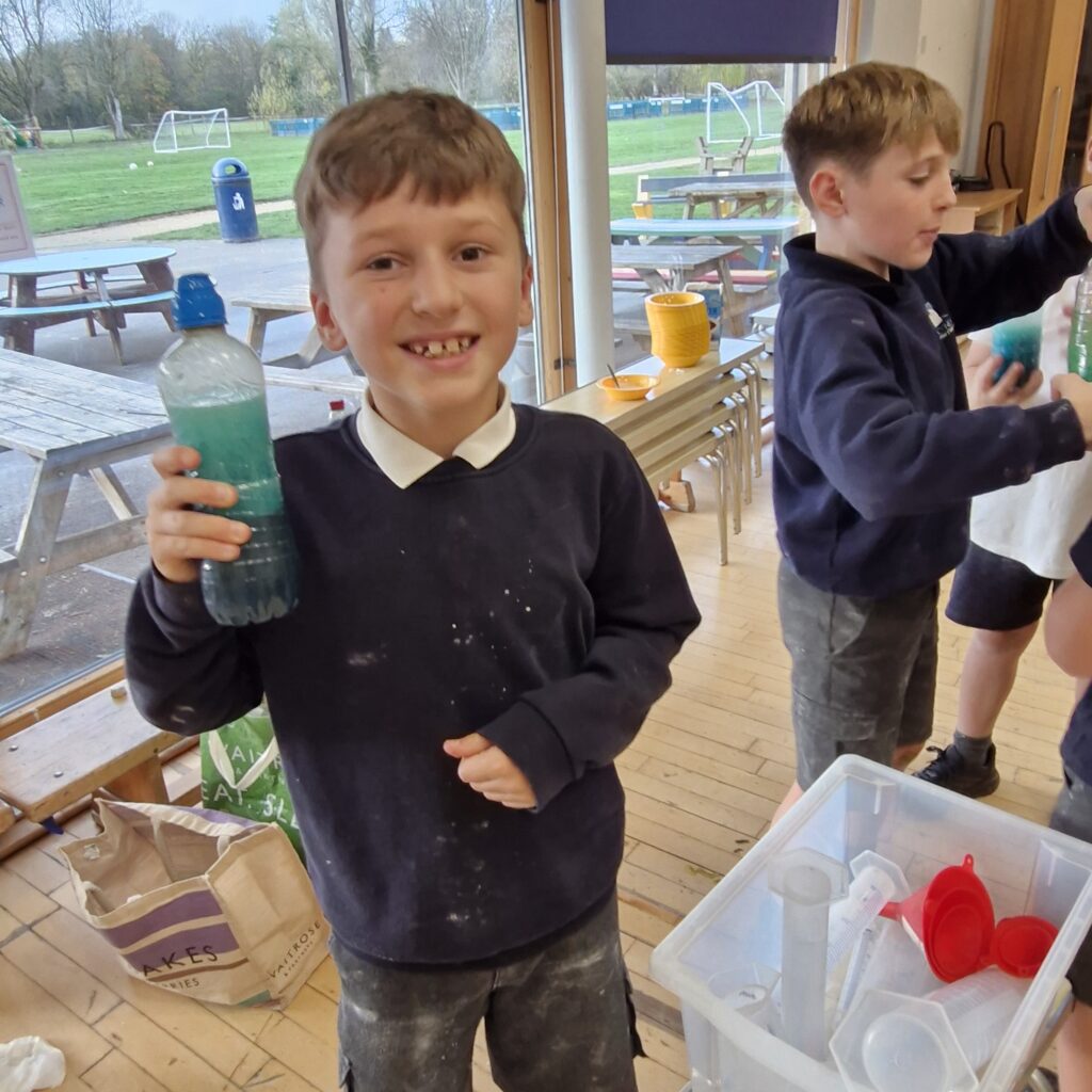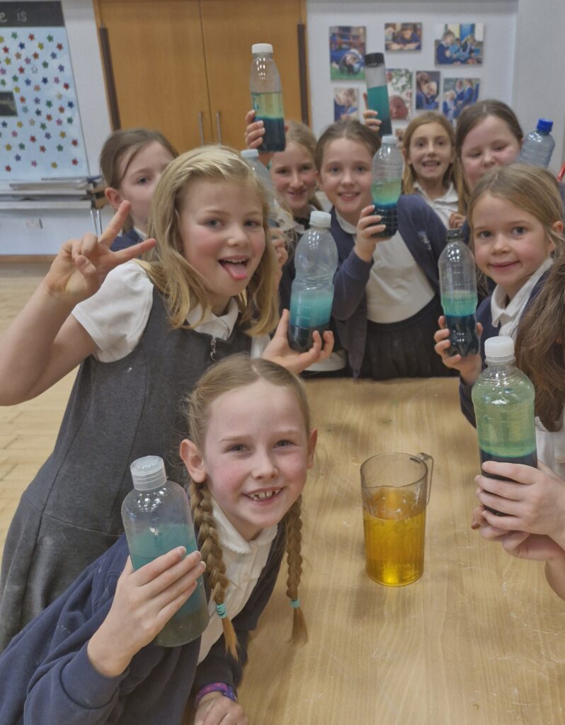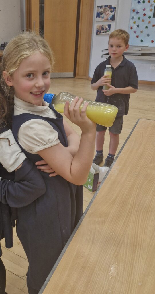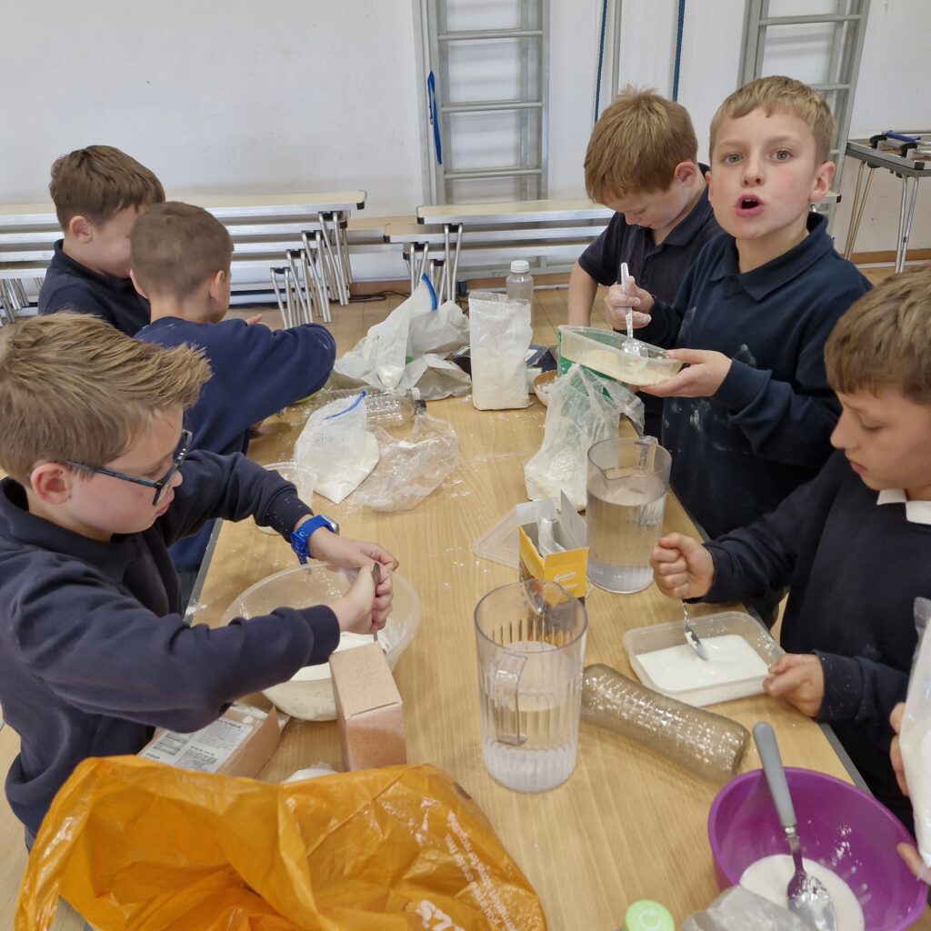 The children have been learning about solids, liquids and gases and their properties. In this practical session they made non-Newtonian fluid (better known as oobleck) and noticed how it behaved like both a solid and a liquid depending on when force was applied. They also made lava lamps and noticed how the bubbles of gas carried some of the coloured water with them.
