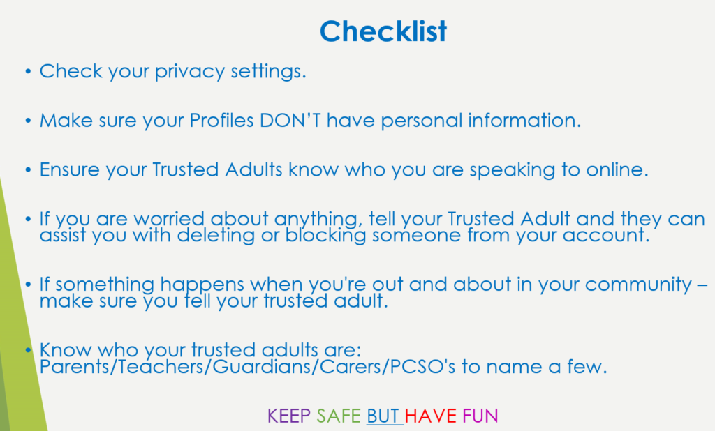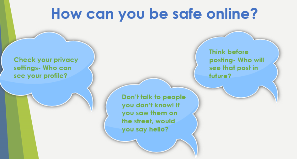 – Suitable technology for their age (including ages for different apps we use) – How to keep safe when using the internet and what a good online profile should look like – What cyberbullying is and the impacts of being hurtful to others online – How to keep safe when out and about with friends and family
