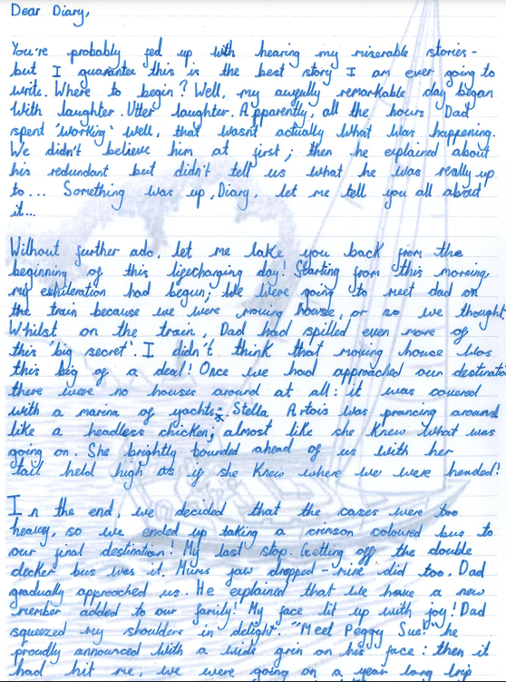 In English this term, we have been reading the novel Kensuke’s Kingdom by Michael Morpurgo. So far, Michael – an eleven-year old boy – has set sail on an around-the-world trip with his parents after his Dad was made redundant from the local brickworks. The family set off with their dog, Stella Artois, in Southampton. Up to now, the voyage has gone well: Michael’s family have visited several exciting locations, including Brazil and South America. However, after leaving Australia, the weather has become perilous and their yacht is now damaged. Michael’s mum is sick with severe stomach cramps. Stella Artois appears on deck, and given that she had previously fallen overboard in the Indian Ocean, Michael tries to retrieve her. A sudden wind takes hold of the yacht…
