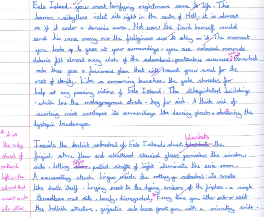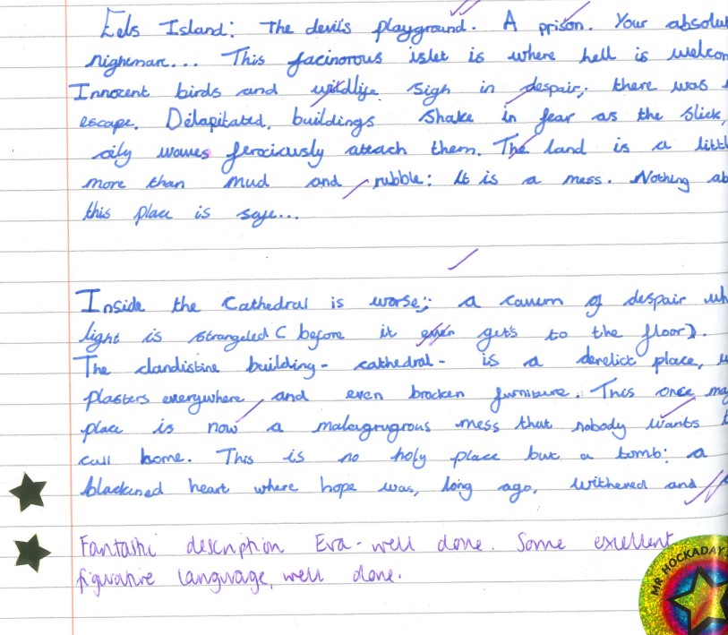We have been working incredibly hard on our writing, thinking carefully about our use of punctuation and its impact on the reader. We have written some fantastic descriptive pieces including setting descriptions of Eels Island and character descriptions of Zoe. Have a read through some of our writing below: