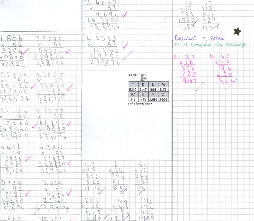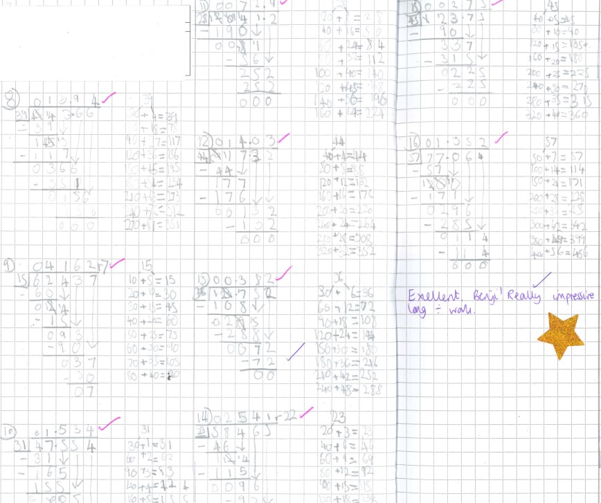 In Maths, we have been focusing on place value as well as addition and subtraction. We have been working hard on using appropriate methods to solve problems efficiently. Have a look at some of our long multiplication and long division work below!