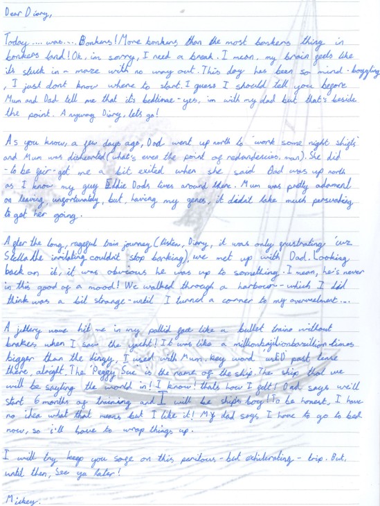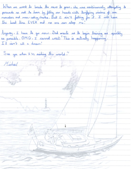 In English this term, we have been reading the novel Kensuke’s Kingdom by Michael Morpurgo. So far, Michael – an eleven-year old boy – has found out that he is about to set sail on an around-the-world trip with his parents, and family dog Stella Artois, after his Dad was made redundant from the local brickworks. We have written diary entries, in role as Michael, to explain his thoughts and feelings ahead of the voyage…