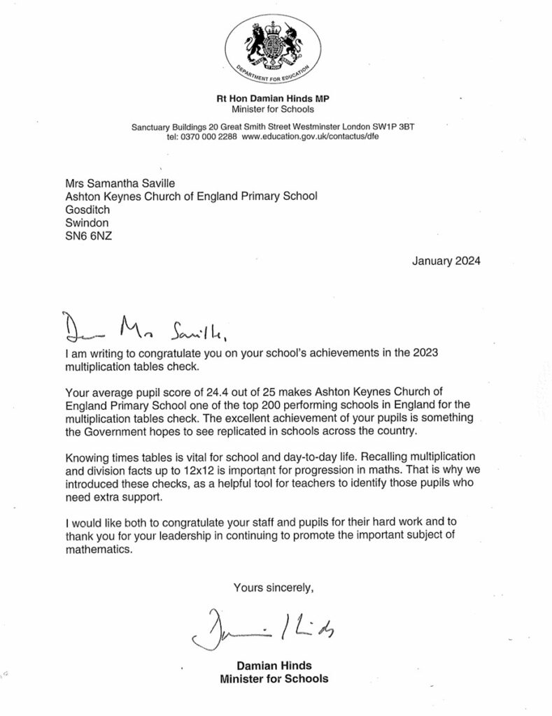 Ashton Keynes received a letter of congratulations from the Minister for Schools in recognition of our achievement in the Multiplication Tables Check. Ashton Keynes was one of the top 200 performing schools in England for the MTC with an average score of 24.4 out of 25.
